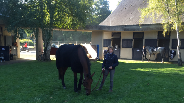After an incredibly long journey (12hours) from Holland we arrived at Le Lion D’Angers, France. Duras travelled in a very large horse box to accommodate him and all of our equipment. Eventers don’t travel light, especially when weather can be questionable this time of year. Unlike cars which can travel up to 120 kmph (75mph), trucks and trailers only go about 80 kmph (50mph). This plus mandatory rest stops every four hours make for very slow progress.
