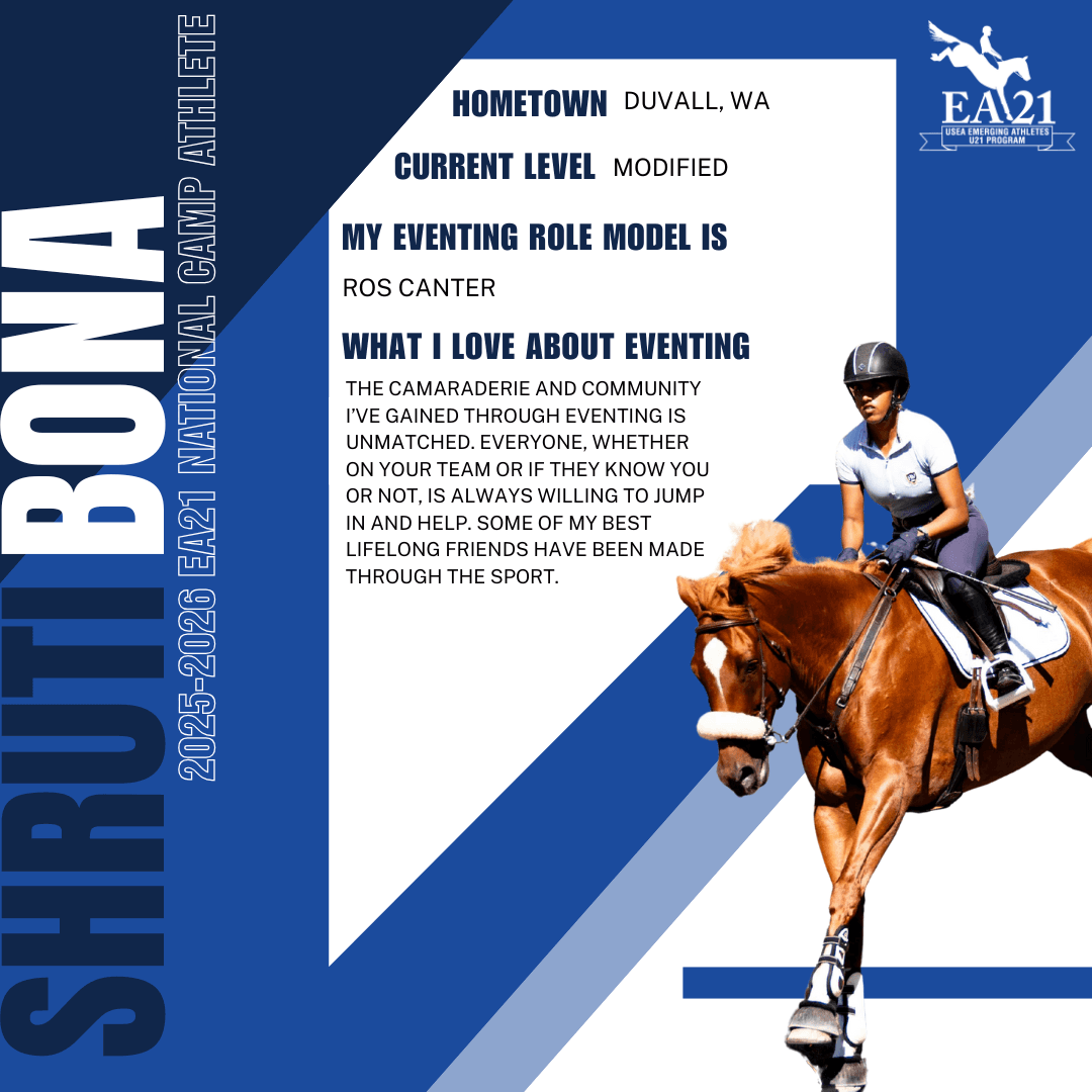 Of these riders, four are returning national camp participants: Shruti Bona, Caitlin O'Roark, Willow Schwartz, and Devon Tresan. The remaining eight riders will be attending the EA21 National Camp for the first time.