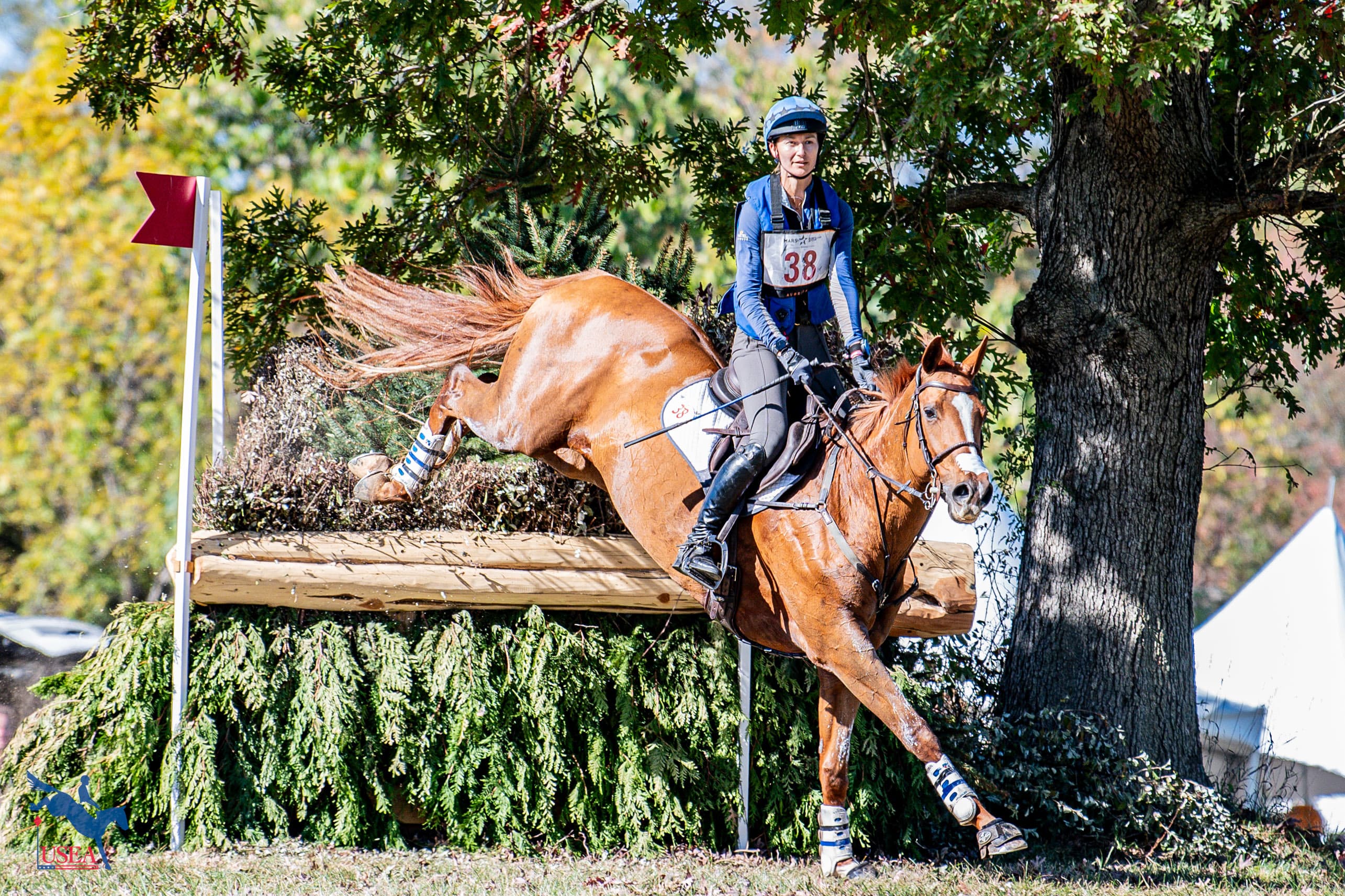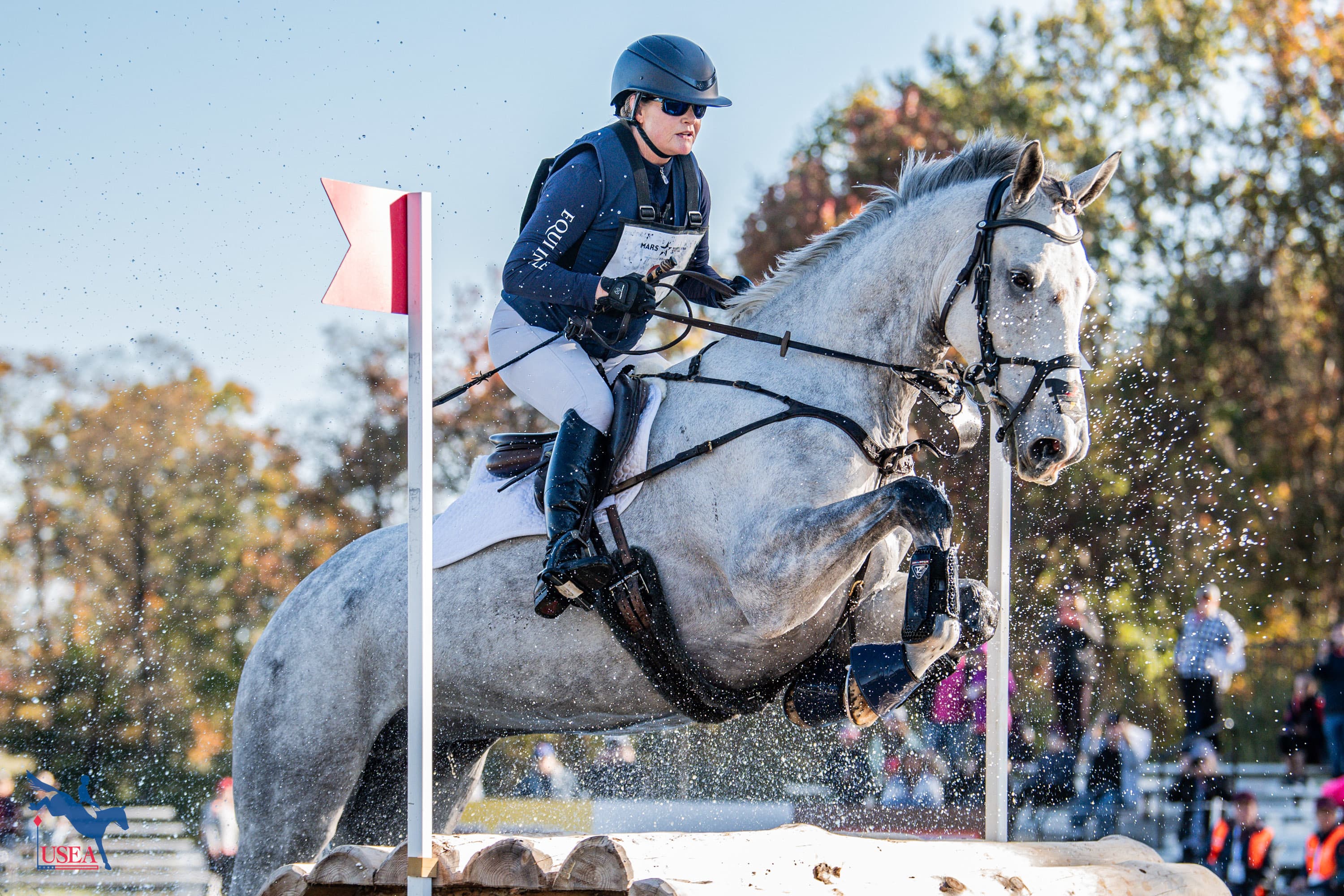 Elkton, Md.—Oct. 18—After Saturday's CCI3*-L cross-country at the MARS Maryland 5 Star, Sharon White and Jaguars Duende ascended from 9th place after dressage to take the lead with a score of 29.6. Sara Schulman held steady in second place on Cooley Chromatic, finishing their cross-country round with a score of 30.6. Alexandra Knowles and P.S. I Love You made an impressive jump from 14th place to third, finishing with a score of 31.4.